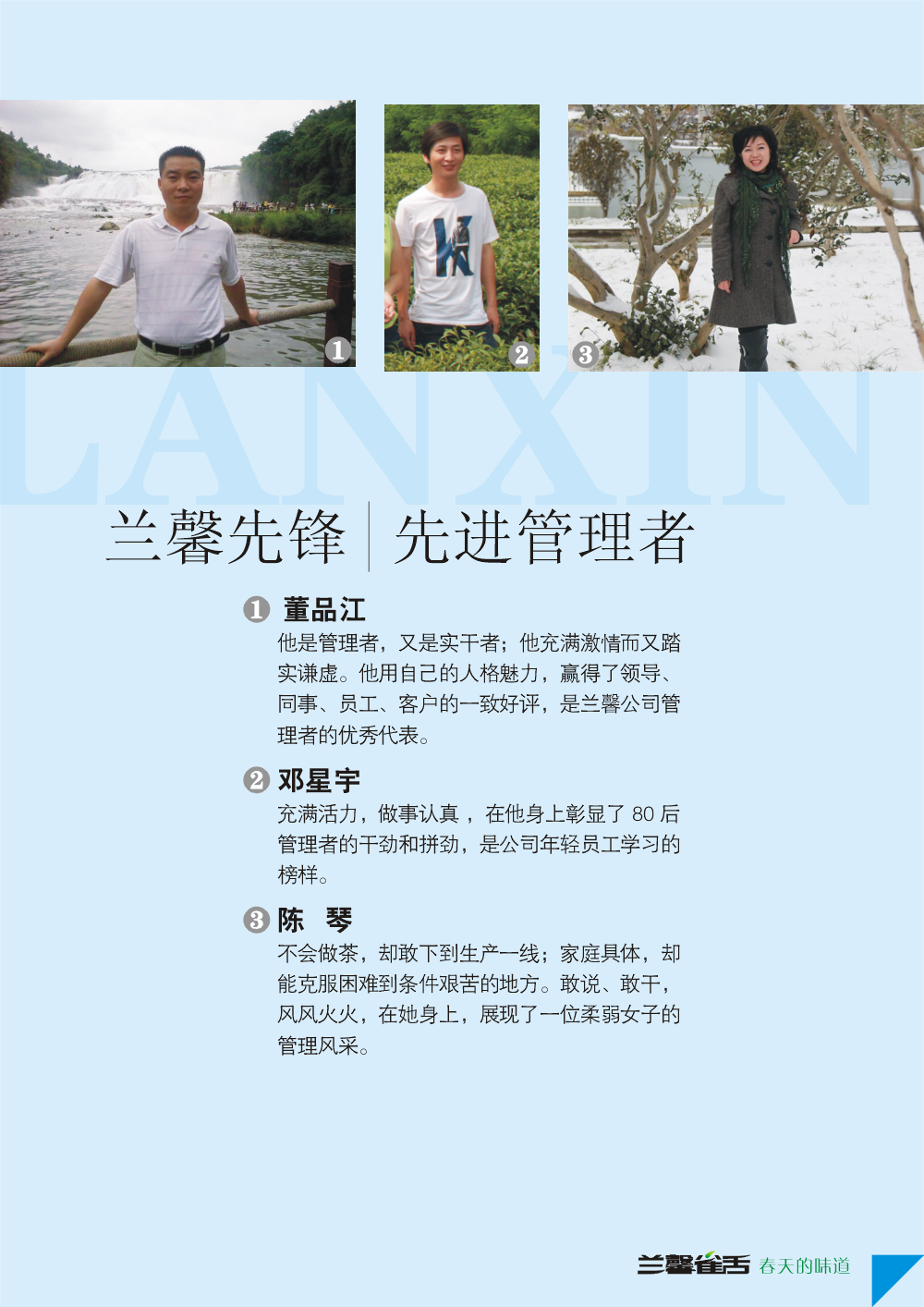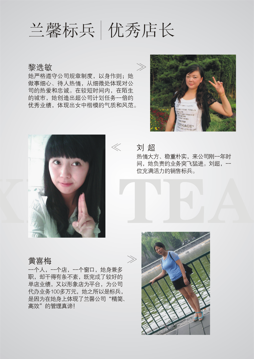 在1月4日的年度述職暨總結表彰大會上,公司對年度優秀個人進行了表彰。表彰了盧大倫、金勝琴、曾東山、丁先晶、羅正文、石曉華、王兆靜、譚世喜、葉蓮花、李遠敏、張 琴等11名優秀員工;表彰了董品江、鄧星宇、陳琴等3名先進管理人員;表彰了黎選敏、黃喜梅、劉超等3名優秀店長。