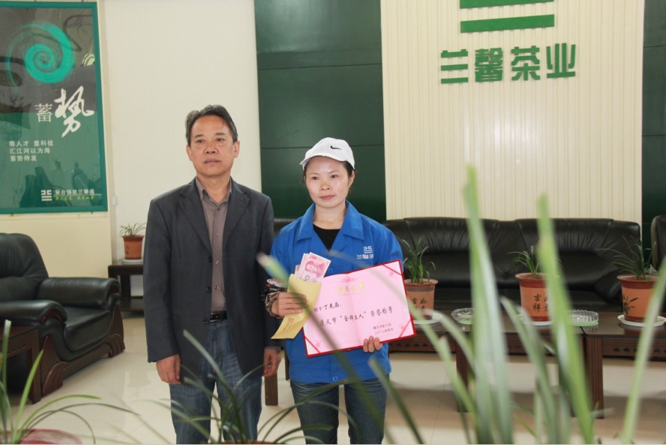 圖:公司制茶工人丁先晶同志(右)獲遵義市總工會授予的“金牌工人”榮譽稱號