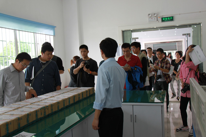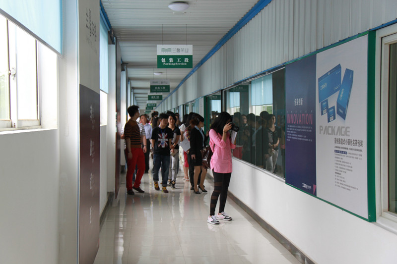網媒記者在公司參觀通道上駐足拍照,抓取車間包裝流程景象