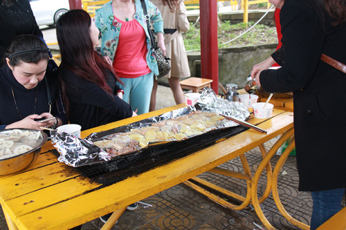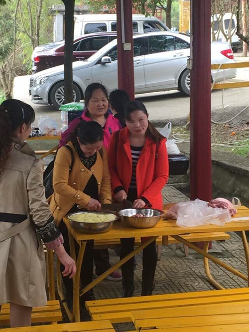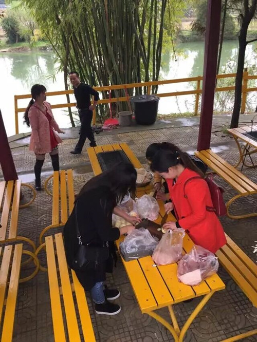 燒烤前食材的準備,女職工分工合作,搭配默契,心情愉悅。