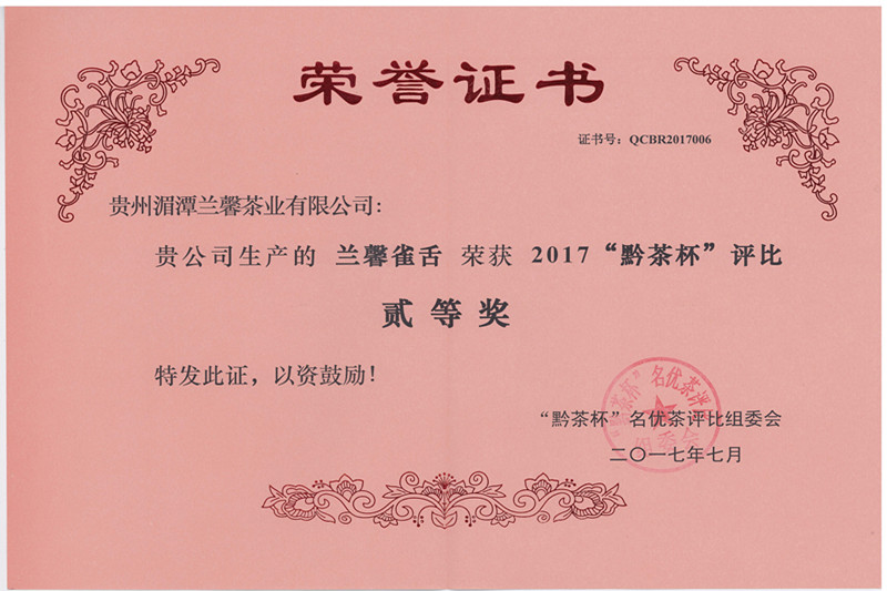 2017年7月,第五屆“黔茶杯”名優茶評比大賽結果揭曉,經過激烈角逐,蘭馨公司產品“蘭馨紅”和“蘭馨雀舌”脫穎而出,在此次評比大賽中分別榮獲一等獎和二等獎。