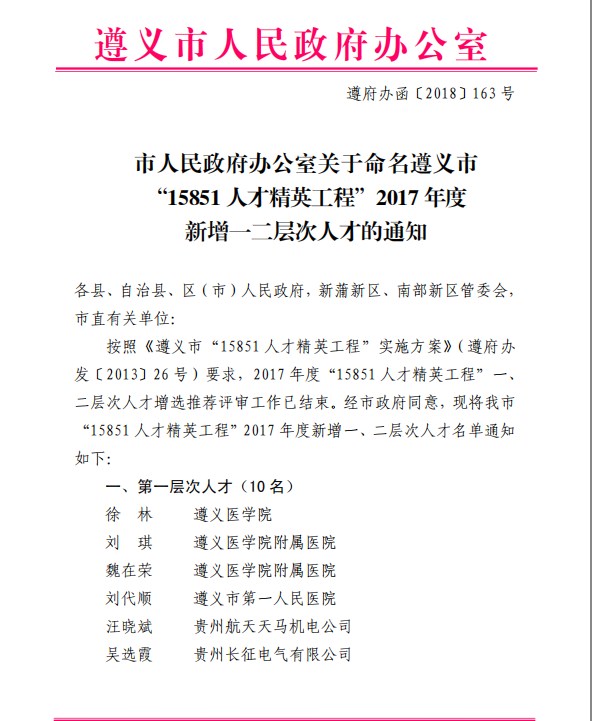 (遵義市“15851人才精英工程”2017年度新增一二層次人才的通知)
