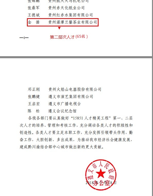 2018年4月11-17日 ,中國農(nóng)村技術(shù)開發(fā)中心網(wǎng)站公示了第一批國家農(nóng)業(yè)農(nóng)村創(chuàng)業(yè)導(dǎo)師名單。共有141人擬入選國家農(nóng)業(yè)農(nóng)村創(chuàng)業(yè)導(dǎo)師庫,貴州湄潭蘭馨茶業(yè)公司董事長金循成功入選。并與2018年7月18日,評選為遵義市“15851人才精英工程”新增一二層次人才。