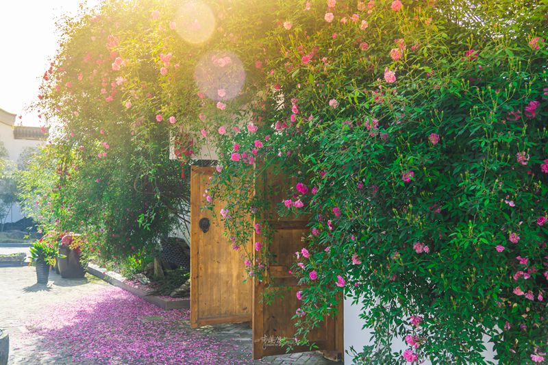 春天的蘭馨莊園被一片綠色包裹著,青瓦白墻,茶香環(huán)繞,薔薇開得正好。