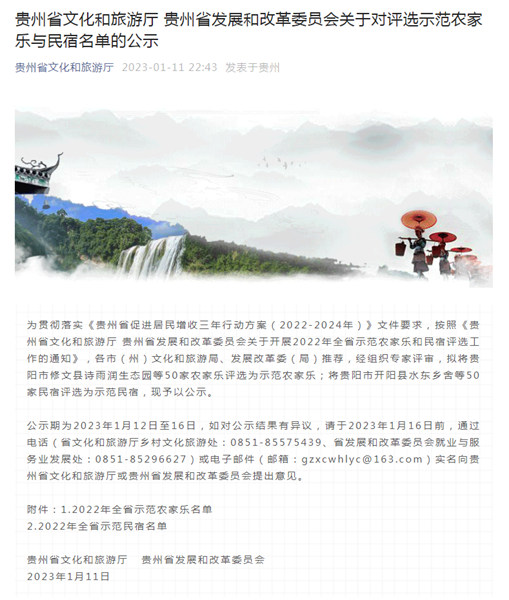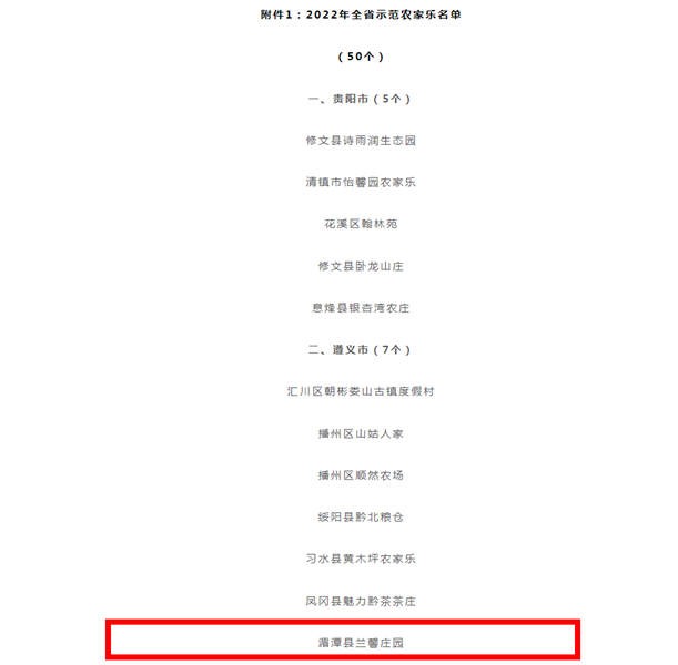 1月11日,貴州省文化和旅游廳對2022年全省示范農(nóng)家樂評定結(jié)果進(jìn)行公示,湄潭縣蘭馨莊園入選2022年全省示范農(nóng)家樂。